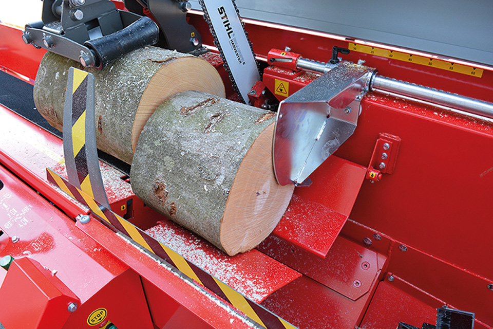 - Fokozatmentesen állítható hasítási hossz 60 cm-ig, a rönkmozgató automatikus leállításával